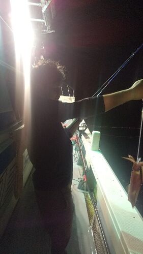 夜釣りのマイカ狙いで17時に出ました。 集魚灯を点けて少ししてからボツボツ上りだしいい感じでしたが10時くらいから突然食い悪くなりました、その後もポツーンポツーンで数延びませんでした、ほぼ10時までの釣果でした。 マイカトップは55杯、スルメイカ…